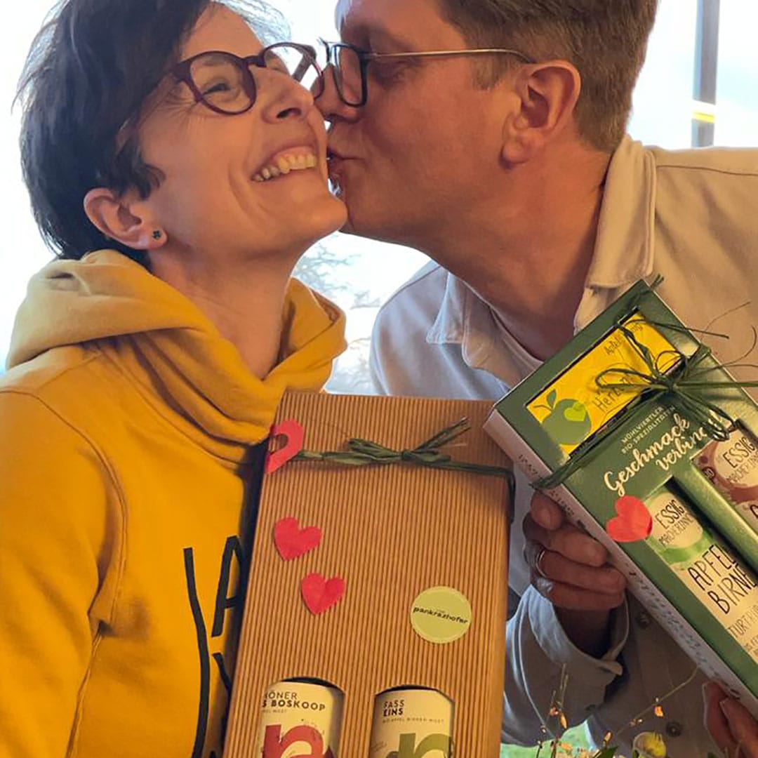 Bei uns beginnt dieser Gedanke nicht erst beim Schenken, sondern viel früher. Wir, Eva und Norbert, führen den Hof gemeinsam – als Paar, als Team, aus Überzeugung. Die Obstbäume, aus denen unsere Produkte entstehen, wurden teilweise von uns gemeinsam gepflanzt, teilweise aber schon von unseren Großeltern und wir haben sie seither gepflegt, im Herbst ihre Früchte geerntet und weiterverarbeitet zu wunderbaren Genussmomenten. Schritt für Schritt, Jahr für Jahr. Mit Geduld, Respekt vor der Natur und mit viel Herzblut. Genau diese Haltung steckt in allem, was unseren Hof verlässt.